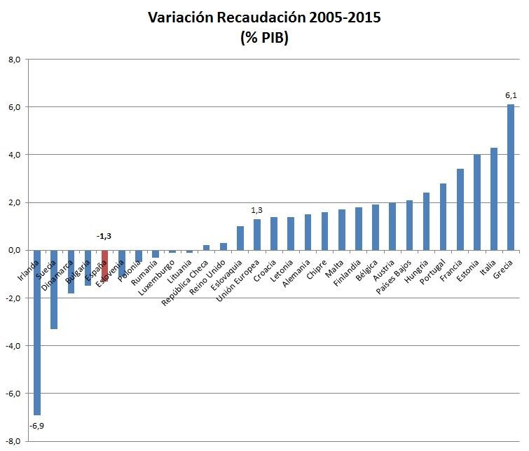 No es España, sin embargo, el país en el que su presión fiscal han perdido más peso en su actividad económica de la última década, sino Irlanda; la importancia de la recaudación fiscal en el PIB irlandés ha perdido casi 7 puntos en el último años. Sobre Irlanda pesan bastantes críticas desde el seno de las instituciones comunitarias por su laxa política en los gravámenes societarios, inferiores a los estándares de la Unión Europea.