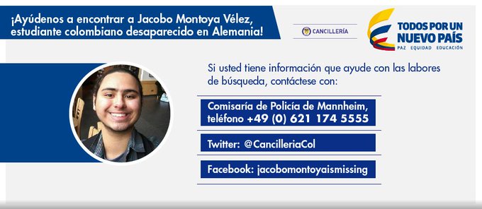 ALEMANIALa historia del joven colombiano perdido en Heidelberg Jacobo Montoya, de 19 años, lleva dos meses desaparecido en Alemania. Una noche de diciembre la tierra se lo tragó. Un chico estudioso y amante de las bibliotecas que es buscado con desesperación por su familia. [image: Heidelberg bei Nacht (Fotolia/eyetronic)] "Danza! Reggaetón. Dancehall. Hip Hop”. Así se promocionaba la fiesta latina que tuvo lugar el pasado 16 de diciembre de 2016 en el bar Ziegler –también conocido como "Billy Blues” – en la Bergheimer Straße, en Heidelberg, Alemania. Hasta allí llegaron unos amigos qu... más »