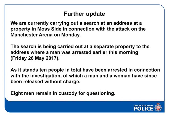 EUROPAOctavo arresto en Manchester Según la policía, en las últimas horas se han efectuado redadas en diversos lugares de Manchester. Diez personas están en estado crítico tras el atentado del pasado lunes en el Manchester Arena. [image: UK | England erhöht Terrorwarnstufe (Reuters/S. Wermuth)] La policía de Manchester confirmó este viernes (26.05.2017) la detención de otro hombre en esa ciudad en relación con el atentado terrorista del pasado lunes (22.05.2017) , al tiempo que continúan las redadas en varias direcciones como parte de la investigación. En un comunicado en Twitter, la ... más »