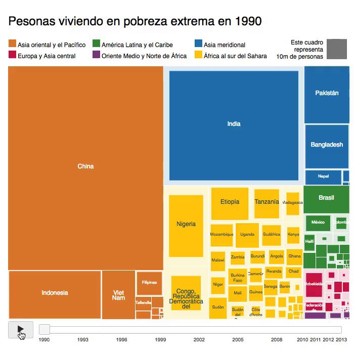 Por ejemplo, el mapa de árbol interactivo incluido más abajo ilustra la evolución del número y la distribución de las personas que vivían en pobreza extrema entre 1990 y 2013. La reducción en la cantidad de pobres en Asia oriental y el Pacífico es impresionante, y pese a la disminución de la tasa de pobreza extrema en África al sur del Sahara a 41 % en 2013, el crecimiento de la población en la región significa que 389 millones de personas vivían con menos de USD 1,90 al día en ese mismo año, es decir 113 millones más que en 1990.