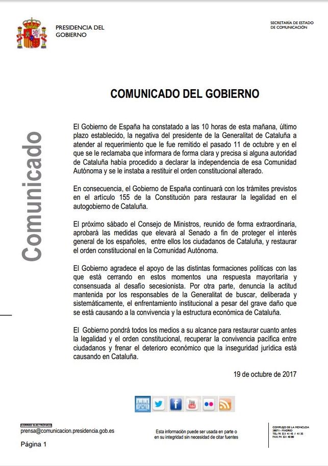 Madrid responde a Puigdemont: La suspensión de la autonomía de Cataluña se activará el sábado Publicado: 19 oct 2017 08:21 GMT | Última actualización: 19 oct 2017 11:40 GMT El Gobierno español ha difundido un comunicado en respuesta a la carta enviada este jueves por Carles Puigdemont al jefe del Ejecutivo, Mariano Rajoy. Descargar video https://actualidad.rt.com/actualidad/253140-madrid-respuesta-puigdemont-carta?utm_source=browser&utm_medium=aplication_chrome&utm_campaign=chrome "*El Gobierno de España continuará con los trámites previstos en el artículo 155 de la Constitución*", qu... más »